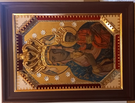 | Renowacja obrazu Madonny z Dzieciątkiem w ramie. Obiekt był bardzo zniszczony: rama zewnętrzna z ubytkami, rozeschnięta na łączeniach, spróchniała i rozpadająca się skrzynka, sfalowana tektura, na której naklejony był oleodruk, braki w elementach ozdobnych, spłowiały i rozpadający się materiał, którym wykończone były wewnętrzne boki skrzynki. | |||