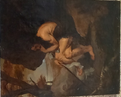 | Obraz olejny na płótnie na oryginalnym francuski krośnie. Stan zachowania: obraz po konserwacji, od odwrocia naklejone łaty, od lica widoczne rozdarcie, liczne wykruszenia warstwy malarskiej wraz z gruntem, odkształcenia płótna od krosna, skąpe kromki płótna, widoczne rekonstrukcje zmienione kolorystycznie i przemalowania | |||
