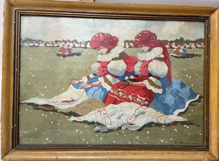 | Obraz olejny na tekturze sygnowany Karpiński. Stan zachowania: lico zabrudzone, pokryte pożółkłym werniksem, odpryski warstwy malarskiej. Deformacja podłoża, wgniecenia i wypchnięcia w tekturze rozwarstwienia na krawędziach | |||