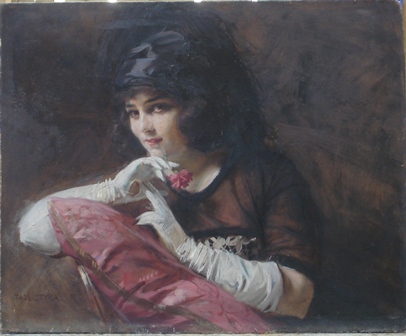 Obraz olejny na płycie sygnowany T. Styka "Dama z kwiatem" Stan zachowania: stare zmienione kolorystycznie retusze, brudny, mechaniczne uszkodzenia tektury na krawędziach |